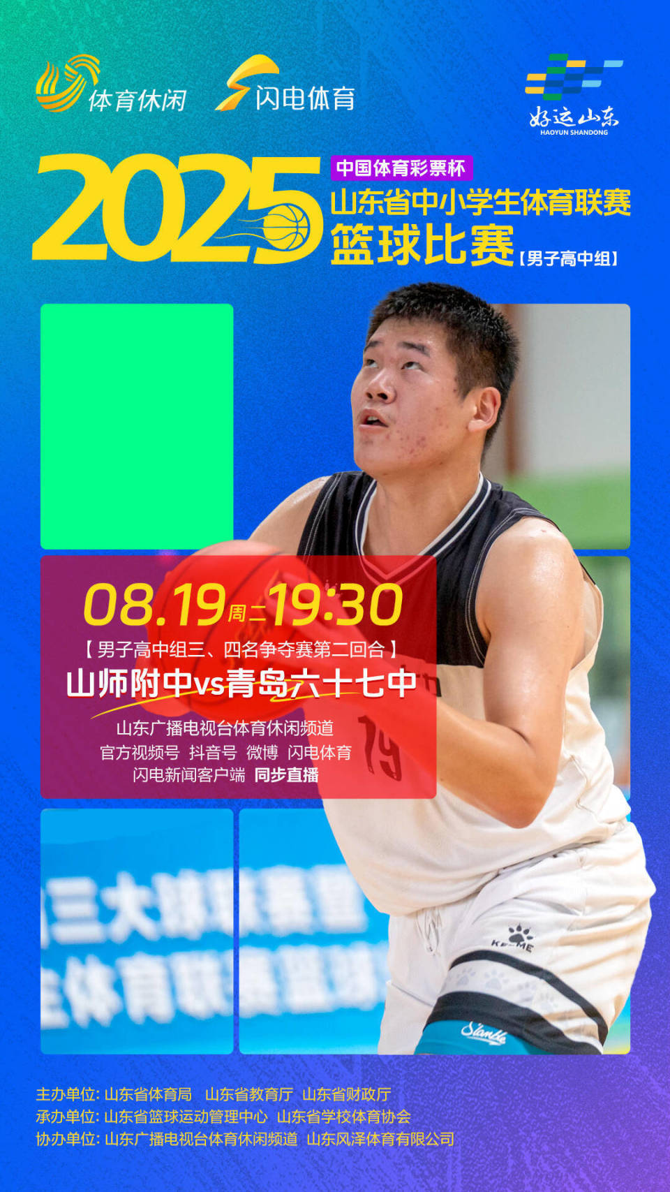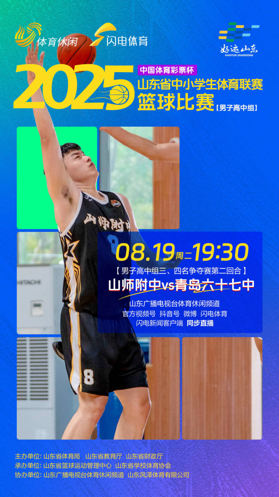好运山东2025年“中国体育彩票杯”山东省中小学生体育联赛篮球比赛(男子高中组)由山东省体育局、山东省教育厅、山东省财政厅主办,由山东省篮球运动管理中心、山东省学校体育协会承办,由山东广播电视台体育休闲频道、山东风泽体育有限公司协办。