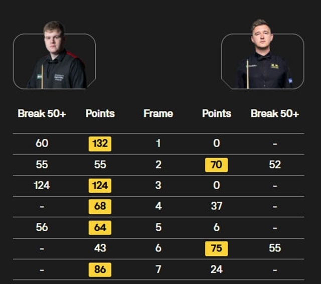 此役,亚伦希尔绝对算是超水平发挥了,前面五局打出了一杆破百(124分)和三杆50+(60分,56分,55分),凯伦威尔逊虽然在第二局凭借单杆52分逆转取胜,不过这也是凯伦威尔逊在前五局赢下的唯一一局,亚伦希尔在1-1之后连胜三局取得4-1的大幅领先,同时也已经在这场9局5胜制比赛中率先拿到了多个赛点,直接将世界第二凯伦威尔逊逼入绝境!第六局,凯伦威尔逊打出单杆55分,挽救了一个赛点,追到2-4。第七局,亚伦希尔86-24拿下,兑现赛点晋级正赛第二轮32强。